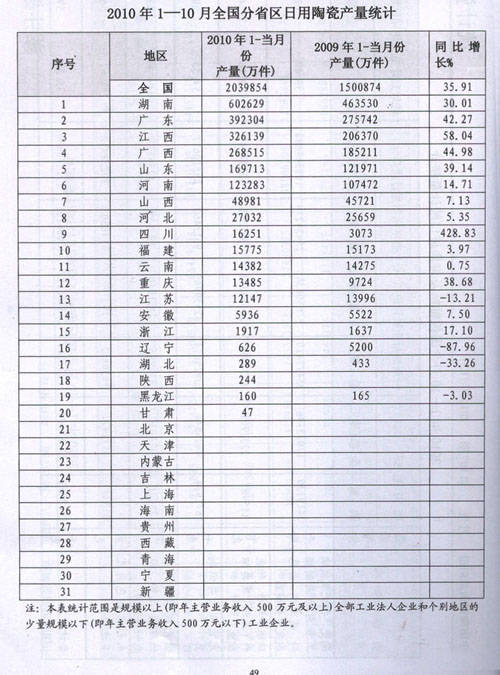2010年1—10月全國分省區(qū)日用陶瓷產(chǎn)量統(tǒng)計