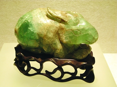 除了玉兔展品外,水晶兔也是展覽的一大亮點(diǎn)。展品中有一件晚清的“水晶兔水注”,完全用天然水晶雕琢而成,小兔蹲伏欲跳,神態(tài)生動(dòng)。這件水晶兔看似是一個(gè)文人用的筆洗,可謂是一件文房珍品。前面介紹的兔子都是閉嘴的,張開(kāi)嘴巴,吐著舌頭的極為罕見(jiàn)。記者就看見(jiàn)一只這樣的“水晶兔子”,它體態(tài)肥碩,短尾上翹,奔跑中,不忘豎著一只長(zhǎng)耳,時(shí)刻傾聽(tīng)周?chē)膭?dòng)靜。這只兔子磨得非常光滑,不知經(jīng)過(guò)多少文人雅士之手。