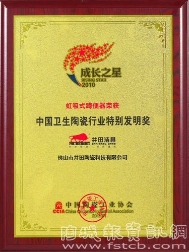 井田潔具又傳佳音,“虹吸式蹲便器”再獲殊榮。2011年1月14日,佛山市井田陶瓷科技有限公司被中國(guó)陶瓷工業(yè)協(xié)會(huì)授予 “中國(guó)衛(wèi)生陶瓷行業(yè)特別發(fā)明獎(jiǎng)”,榮獲行業(yè)頂級(jí)獎(jiǎng)項(xiàng)。得獎(jiǎng)產(chǎn)品“虹吸式蹲便器”是井田的“發(fā)明專利產(chǎn)品”、“明星產(chǎn)品”,素有“天下第一蹲”的美譽(yù)。