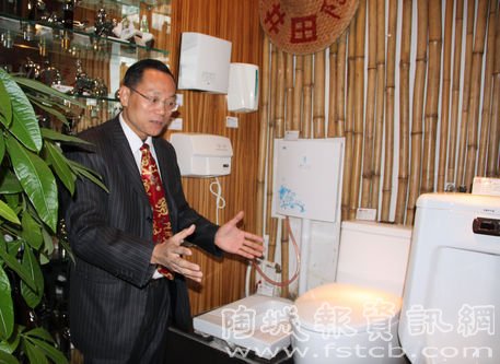 井田潔具總經(jīng)理、“虹吸式蹲便器”發(fā)明者陳小練先生正在講解獲獎(jiǎng)產(chǎn)品。