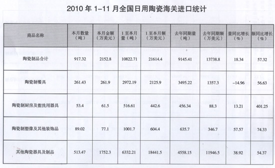 2010年1-11月全國日用陶瓷海關(guān)進口統(tǒng)計