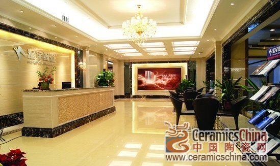 走進(jìn)宏宇總部展廳。進(jìn)入大門乘著手扶電梯徐徐直上二樓,右邊流光溢彩的畫面撲進(jìn)眼簾。寬敞的長方形大堂,正側(cè)面墻壁上品牌標(biāo)識(shí)與“千年精髓,前承后璀”形象畫醒目而協(xié)調(diào),天花板中間懸著水晶吊燈,墻地一體化鋪貼了木紋拋光磚,經(jīng)過精細(xì)加工的上墻瓷磚尤其酷似天然石材,淺黃的地面拋光磚四周點(diǎn)綴了一圈由深色全拋釉產(chǎn)品組成的藝術(shù)拼圖,更添空間層次感。