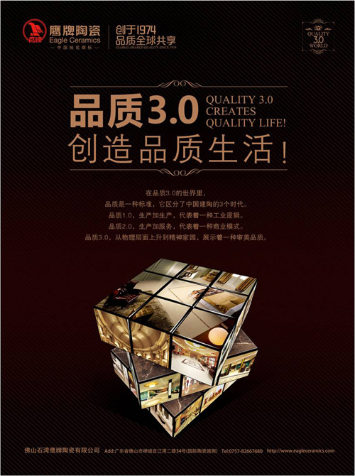 在3·15國(guó)際消費(fèi)者權(quán)益日來臨之際,鷹牌陶瓷首度發(fā)表“品質(zhì)3.0”白皮書,提出以“品牌、產(chǎn)品、服務(wù)”為一體的整體品質(zhì)提升發(fā)展戰(zhàn)略。這戰(zhàn)略承襲了鷹牌陶瓷一直以來品質(zhì)核心的品牌理念,站在行業(yè)和市場(chǎng)的高度將品質(zhì)定義為一種標(biāo)準(zhǔn),區(qū)分了中國(guó)建陶發(fā)展的三個(gè)時(shí)代。