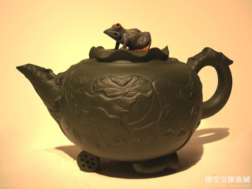 中國工藝大師們制作的精美陶器,令人嘆為觀止。這件“蔣美珍陶瓷藝術(shù)作品荷塘月色”就是讓人震驚的陶瓷藝術(shù)品。此壺采用原礦菜茄泥制作而成,這種泥料是由本山綠泥與白泥相拼,并適量加入鉻綠,制成菜茄泥。作品的壺身以荷葉為主題,看似簡單,很考驗(yàn)工藝師的拼貼和雕塑技巧。壺蓋以一青蛙點(diǎn)綴,為夏日喝茶帶來生機(jī)盎然的趣味。作品底部則以數(shù)節(jié)蓮藕托起荷葉,生動(dòng)形象。整個(gè)作品處處洋溢著荷葉的風(fēng)姿和寧靜的荷塘景色。此壺于2005年榮獲第七屆中國工藝美術(shù)師精品博覽會(huì)金獎(jiǎng),收藏價(jià)值頗高。