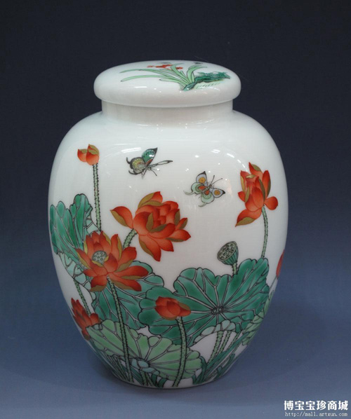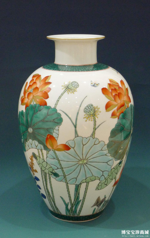 在博寶寶珍商城的當代名家瓷中,江月古的作品擁有極佳的人氣和極高的點擊率,許多藏友對與這種明麗的瓷藝風格十分著迷,卻不知古彩瓷作為由景德鎮(zhèn)陶瓷藝人創(chuàng)造的一種釉上彩擁有悠久的歷史和極高的欣賞收藏價值。發(fā)展至今,古彩更是將它的特色發(fā)揮的淋漓盡致,色彩上,清新明麗,構(gòu)圖上疏密有致,線條上緊致有序。融繪畫與瓷藝與一身,頗具“唐三彩”遺風,同時具有濃郁的時尚氣息,備受推崇。這件《和氣致祥》古彩瓶造型精美,匠心獨運,瓶上的圖案繪畫精致,荷花嬌艷欲滴,曼妙多姿,淡雅色彩的荷葉蓮藕別有韻味,襯托出荷花的美,蝴蝶飛舞增添動感美,為瓷瓶平添了幾分生氣,極具欣賞價值。