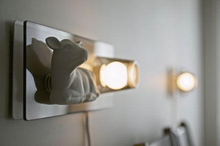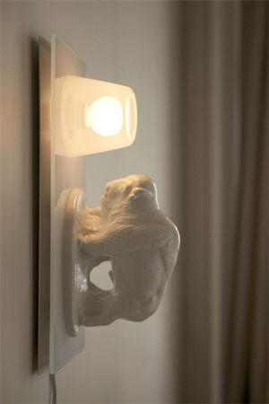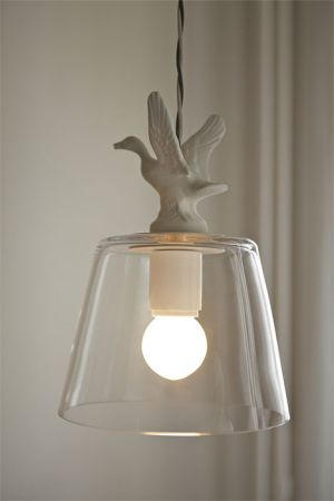 這是一次陶瓷和玻璃的結合。設計師為某漁獵俱樂部設計了這款融合了兩種不同材質(zhì)原料的動物系列燈具,作品中包含吊燈和壁燈,但毫無例外的,都采取了瓷質(zhì)動物形象作為燈具裝飾?梢钥吹剑w禽形象被用于裝飾吊燈,而普通動物形象則被安置在壁燈上,與燈具功用相互呼應。