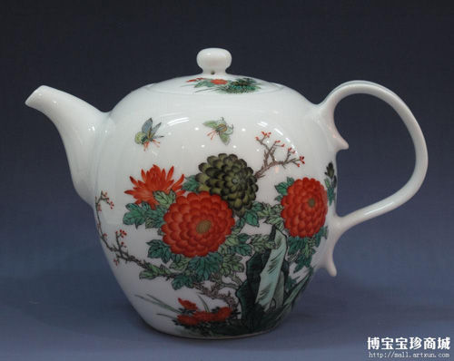 江月光的古彩瓷在一種雅致的氛圍中透露著古香,色彩明麗卻不顯雜亂,精湛的技藝使得作品更具層次感和細膩美。圖中展示的這件來自于博寶寶珍商城的古彩壺《莫嫌老圃秋容淡》也是出自江月光之手,色彩飽滿,氣韻非凡,瓷壺造型精美,匠心獨運,繪畫技藝精湛,栩栩如生,筆法簡練生動,紋理清晰可見,色彩對比強烈,是件難得的瓷壺精品。(博寶藝術(shù)評論員 孫瑞峰 撰文)