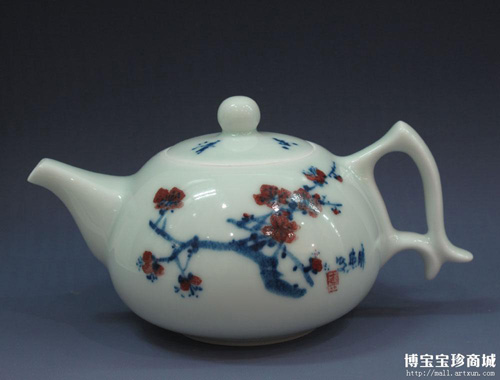 秦勝照老師善于對(duì)梅蘭竹菊等品質(zhì)高雅的藝術(shù)題材的駕馭,這一件來自于博寶寶珍商城的青花釉里紅《梅花五!穳,造型小巧精致,尤其對(duì)壺把的設(shè)計(jì)既實(shí)用又獨(dú)具藝術(shù)美感,釉面光潤潔白更加凸顯出梅花的柔美多姿,紅釉沉靜而嬌媚,飽滿而含蓄,令人賞心悅目。
