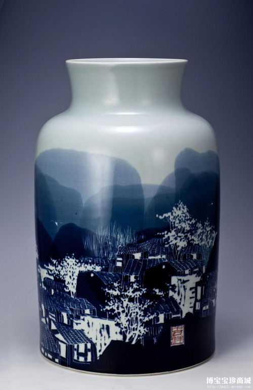 羅小聰老師偏愛表現(xiàn)民居題材,這源于他質(zhì)樸純潔向往自然的精神追求。這一件在博寶寶珍商城展出的青花剃青瓷板《美麗家園》,畫面呈現(xiàn)出秀潤寧靜的獨特美感,觀眾既可以通過朦朧起伏的山巒感受到村野的濕潤氣息,又可以透過充滿生活氣息的民居建筑體會到小村的安寧祥和,一草一木都清晰地呈現(xiàn)在觀眾眼前,展現(xiàn)出無窮的藝術(shù)魅力。博寶藝術(shù)網(wǎng)評論員夏末撰文)