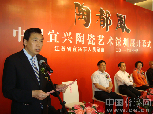 宜興市長王中蘇在中國宜興陶瓷藝術(shù)深圳展介紹情況。