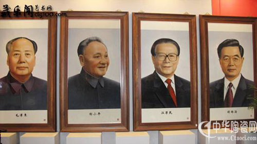 該作品是在以獻(xiàn)禮中國共產(chǎn)黨成立90周年為創(chuàng)作背景,謳歌黨和國家的領(lǐng)導(dǎo)人(毛澤東、鄧小平、江澤民、胡錦濤——從左至右依次),感受中國共產(chǎn)黨走過90載的光輝歷程,吳錦華大師特以“四代偉人像”展現(xiàn)讓今天幸福生活在紅旗下的中國人領(lǐng)略四代領(lǐng)導(dǎo)人的風(fēng)采。