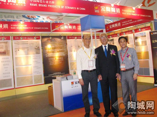 中國(guó)陶瓷工業(yè)協(xié)會(huì)理事長(zhǎng)何天雄(中)親臨宏陶陶瓷展位參觀指導(dǎo)