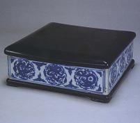 隆慶朝歷時僅6年,傳世瓷器不多,像這種造型的器皿較為少見。隆慶五年,部御史徐拭在向皇帝建議減緩燒造上疏中說:“三層方匣等器,式樣巧異,一時難造。”所提及的3層方匣有可能就是這種方格盒。這種盒體為方形,口徑9*8.8cm,盒內(nèi)有“十”字形隔板使之分成4個小方格。胎體厚重,砂底坦平,唯中內(nèi)凹施白釉,釉下書有“大明隆慶年造”楷書款。盒的四周分別繪有3個團龍紋。青花色澤鮮艷,藍中泛紫。