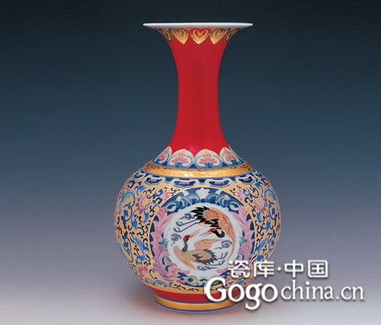 圖:中國(guó)紅描金工藝松鶴延年天球賞瓶
