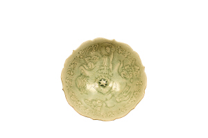 1998年6月,瓊海漁民在西沙華光礁捕魚(yú)作業(yè)時(shí),采挖出北宋瓷器和錢(qián)幣。其中,最具傳奇色彩的就是做工精美,釉色呈天青色的龜鶴仙人紋碗和盤(pán)。碗葵花形口沿,胎體薄而透光,釉水天青色,碗心有一凸起小龜,碗內(nèi)壁刻劃仙人、仙鶴、龜、祥云?袒ㄐ性屏魉,刀法嫻熟,各個(gè)造型惟妙惟肖,出神入化。仙人飄逸灑脫,仙風(fēng)道骨,欹側(cè)揖讓觸處成妙。仙鶴曲頸而棲,恬適靜美。龜則騰云駕霧,遒勁而走。龜盤(pán)刻劃內(nèi)容亦然,不同之處為淺腹,淺圈足。碗和盤(pán)底均無(wú)釉?坍(huà)之灑脫浪漫,可以想象古人了然于胸,飛刀走石之間,天馬行空,飛逸奇恣,一氣呵成的優(yōu)雅一瞬。