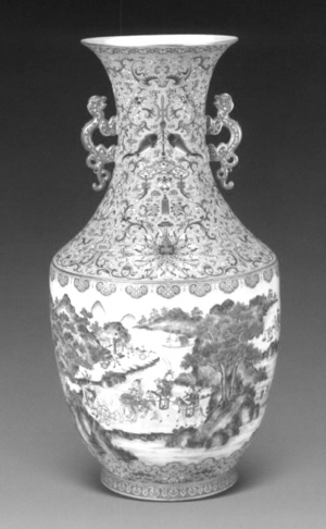 乾隆時期,粉彩盛行,色彩濃艷明麗,紋飾繁縟,盡顯御用瓷器的奢靡之風(fēng)。而嘉慶官窯瓷器就像嘉慶帝本人性格一樣,只會沿襲乾隆時期的舊制,紋飾多采用傳統(tǒng)圖案,繪制技法則工筆多于寫意,燒造大件器物增多,而且形體高大,不因胎體厚重而變形,器形端莊,依然顯示出傳承一脈的乾隆晚期高超制瓷工藝。所謂“父子相傳,乾規(guī)嘉隨”而已。