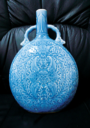 提起孔雀藍(lán)釉瓷,人們便會(huì)想起2004年香港蘇富比的春季藝術(shù)品拍賣,此場(chǎng)拍賣的重頭戲是286號(hào)明宣德孔雀藍(lán)釉盤,1238.24萬港幣的拍賣成績(jī),成為單色釉瓷器拍賣的最高紀(jì)錄。這只天價(jià)盤子原屬英國(guó)鐵路退休基金會(huì),記錄良好,品相極佳,盤形優(yōu)美。器壁暗刻花紋,盤底青花雙圈六字官款?兹杆{(lán)釉發(fā)色均勻鮮艷,專家坦言:就明代早期瓷器的燒造水平而言,此類品種在世界上存世量不超過十件,實(shí)屬絕代珍品。