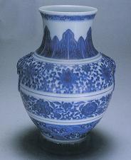 乾隆時(shí)期青花瓷器形制多樣。此尊高25.5cm,口徑9.7cm,敞口,短頸,鼓腹,高圈足,形似燈籠,又稱燈籠尊,肩兩邊有對(duì)稱鋪首。頸部繪蕉葉紋,腹部分兩組,均飾纏枝花卉,下邊是翻騰的海水。各組紋飾以一圈白釉隔開,繁而不亂,層次分明。青花色澤濃重,有暈散。其造型與紋飾融為一體,產(chǎn)生了明顯的藝術(shù)效果。尊底中書“大清乾隆年制”青花篆書款。