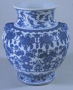 該器具高29.2cm,口徑15.8cm,侈口,短頸,鼓腹,足外撇,肩部置對(duì)稱的獸面銜環(huán)耳。頸部飾云蝠紋,肩部繪如意形云紋,腹上部為瓔珞紋。腹部主題紋飾為花卉盆景,好似集天下名品于一起,栽植在各個(gè)花盆內(nèi),置放在貫形支架上供人欣賞。尊的足部飾纏枝蓮紋。尊的造型渾厚端正,樸茂中隱含秀質(zhì)。青花顏色穩(wěn)定,精細(xì)的紋飾華貴俏麗,給人以美的享受。