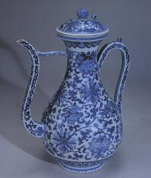 此壺是由玉壺春瓶演變而來(lái)的,故又稱“玉壺春壺”。通高31cm,侈口,細(xì)頸,溜肩,垂腹,圈足外撇,頸至腹間設(shè)長(zhǎng)流和曲把,形狀秀美穩(wěn)重。腹部主題紋飾為纏枝蓮?fù)邪藢殻、下以蓮瓣紋為陪襯,流飾折枝花卉,柄是卷草紋。青花色調(diào)藍(lán)中閃灰,呈色穩(wěn)定,具有乾隆朝的風(fēng)格。繪畫筆法纖細(xì)拘謹(jǐn),畫面顯得呆板,是嘉慶時(shí)的特征。