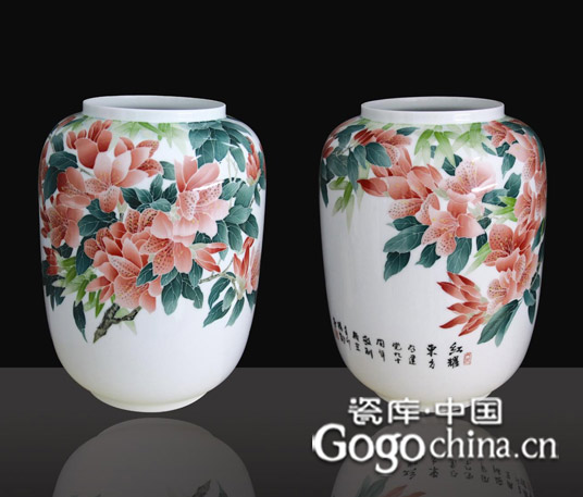 圖1:建黨90周年紀(jì)念品紅耀東方釉下五彩映山紅花瓶