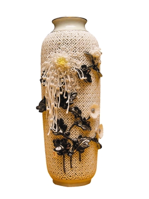 “‘堆塑通雕’、‘貼花通雕’等都屬于通花陶瓷類型,其吸收了潮汕其他民間工藝美術(shù)——例如木雕和石雕的攜刻鏤空手法,制成通雕花瓶或者花籃,再堆貼用裝飾土制作的瓷花燒制而成。楓溪堆塑通雕花籃,以1979年制作的大型作品《春色長在大花籃》為代表作,現(xiàn)陳列于北京人民大會堂廣東廳內(nèi)。”