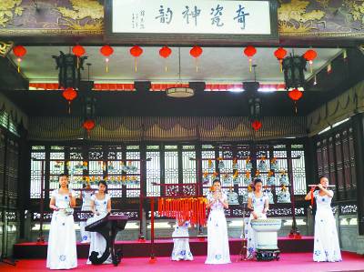 來到古窯,千萬不能錯(cuò)過的,就是青花瓷樂隊(duì)的演出。舞臺(tái)設(shè)在湖面上,涼風(fēng)襲來,荷花飄香,身著青花瓷圖案長(zhǎng)裙的美女樂手們魚貫而入,動(dòng)聽的音樂悠然響起。這套瓷樂器包括瓷甌、瓷笛、瓷簫、瓷方響、瓷鼓、瓷管鐘、瓷編鐘、瓷胡琴等,充分體現(xiàn)了景德鎮(zhèn)瓷器“聲如磬”的特點(diǎn),演奏出的樂曲優(yōu)美流暢,柔和婉轉(zhuǎn),精致細(xì)膩,回味無窮。