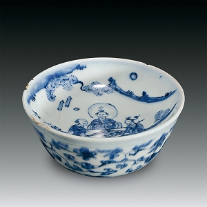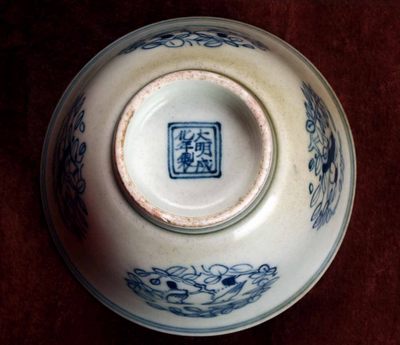 成化多淡描青花。紋飾布局前期疏朗,后期繁密,多畫三果、三友、九秋、高士、嬰戲、龍穿花等;ㄈ~似手掌撐開狀;葉子多齒邊,花葉均無陰陽正反;魚藻的水草飄似海帶;山石似鑰匙狀無凹凸感;邊飾較簡單,碗、盤、杯等口沿、圈足僅用弦紋裝飾;龍多為夔龍,鼻子長長的像象鼻;十字寶杵、阿拉伯文等伊斯蘭教內(nèi)容的紋飾多見。胎質(zhì)細(xì)膩潔白,釉極細(xì)潤有玉質(zhì)感,但稍微發(fā)青。器型有罐、梅瓶、洗、盞托、盤、杯、碗等,爐為三乳足筒式或鼓形爐?钭R除“天”字罐外,還有“大明成化年制”六字單、雙行款;圖記款主要有方勝、銀錠等。