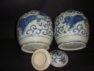 正德仍用國產(chǎn)料,前期用平等青,發(fā)色灰藍(lán)。晚期始用回青。有的暈散。其器物的器型、胎質(zhì)、釉質(zhì)與弘治接近,氣泡密集。深腹碗、帶座器等流行。后期多見大器。紋飾常見的有鳳穿花、魚藻、獅子繡球、庭園嬰戲、樹石欄桿、蓮?fù)邪藢毜,繪畫較弘治的粗。碗盤底心下蹋,碗出現(xiàn)雞心底。器底多見窯紅、粘砂、跳刀痕等現(xiàn)象。年款有四字和六字楷書款,個別用“造”字。