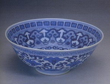 道光時期的制瓷技術(shù)水平遠(yuǎn)不如前代,但官窯產(chǎn)品中卻有不少精品,此碗即是較為精致的一件?趶15.1cm,侈口,廣腹,圈足。碗內(nèi)外滿飾花卉,外沿下飾幾何錦地紋,腹部主題紋飾為纏枝蓮,下繪變體蓮瓣紋。青花色調(diào)藍(lán)中稍閃紫的光澤,圖案結(jié)構(gòu)緊湊,繁密而清晰,胎釉較為精細(xì),燒制工藝也很講究。