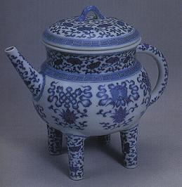 盉為酒器。瓷盉最早出現(xiàn)于東周時期,多仿青銅盉造型。這件盉壺通高21.5cm,為四柱形,直流,從腹上部向  前斜出,弧形柄盉蓋微凸,中間有一半環(huán)式系。蓋  面、足部繪纏枝靈芝紋,腹部主題紋飾為朵蓮托八寶。腹底書“大清道光年制”。青花色澤濃重,繪  畫嫻熟,紋飾精細,釉面光潤無瑕。