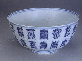 在瓷器上用文字進行裝飾始于唐代,而完全用文字進行裝飾的瓷器在康熙時期達到鼎盛,常見的有青花筆筒上寫滿整首辭賦、詩文。在北京故宮博物院藏有一件用“壽”字作裝飾的康熙年間青花壽字大瓶,通身寫滿不同篆體“壽”字一萬個,故又稱萬壽大瓶。這件碗口徑15.7cm,胎骨細(xì)膩,白釉瑩潤。碗的腹部用青花畫有上下兩行不同篆體“壽”字,碗心有蝙蝠、壽桃,碗底繪蝙蝠圖案。