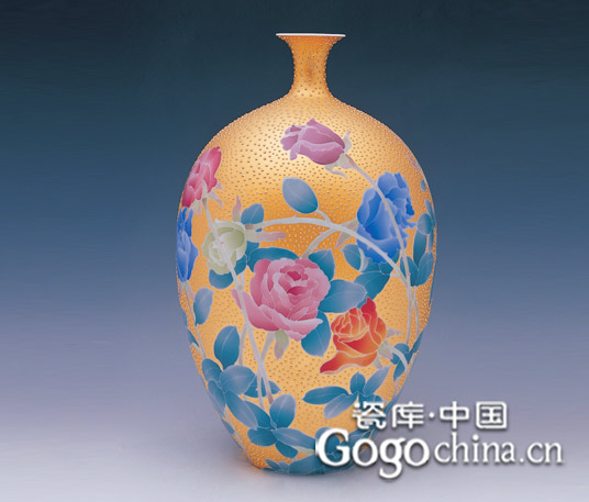 圖:玫瑰花語(yǔ)高檔釉下五彩金鑲玉花瓶