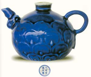 圖:明宣德魚(yú)子藍(lán)釉蓮瓣梨行壺(缺蓋、底有崩)