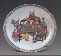 如圖2為清雍正景德鎮(zhèn)窯瓷胎畫琺瑯?gòu)邋鷮膱D盤。高4.4厘米,口徑20.5厘米,底徑13厘米。這只雍正瓷胎畫琺瑯?gòu)邋鷮膱D盤高4.4厘米,口徑20.5厘米,底徑13厘米,是根據(jù)清代宮廷畫家陳枚《月曼清游》圖冊中的《閑庭對弈》圖所繪。盤心繪五仕女圍桌對弈,仕女的體態(tài)頎秀婀娜,眉目俊美端莊,裙衫華麗,鬢飾高雅,氣質(zhì)矜貴,可見是身份較高的貴族婦女。在人物情態(tài)的表現(xiàn)方面,每個人的神情都圍繞著棋局的進展,或沉吟猶豫、或欲言又止、或悠悠閑觀、或悄聲議論,都能各盡其態(tài),生動而不失人物性格的嫻淑溫雅。人物后以多寶格為背景,格上書籍文玩陳設(shè)繁復(fù),皆具透視與實感效果。室內(nèi)擺設(shè)富麗堂皇,恰是一幅“鏡戶團圓清晝永,揪枰斜倚共敲棋”的閨樂圖。瓷胎畫琺瑯器源自于銅胎琺瑯器,創(chuàng)燒在康熙中晚期,終止于乾隆初年;旧嫌汕鍖m造辦處掌握彩料、彩繪和彩燒工藝,制成品又局限于宮廷御用,“庶民弗得一窺”。 此盤胎質(zhì)細膩,釉面光潔,釉色白中泛青。繪畫工細,設(shè)色淡雅,人物、場景刻畫精微。底部“雍正年制”四字楷書藍料款,為不可多得的瓷器珍品。