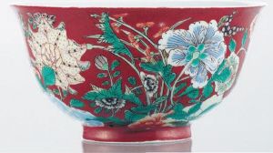 清宮御瓷九秋同慶:康熙后期清宮彩瓷一改此前雄麗蒼勁之風(fēng)格,特別在吸納西洋技藝之后,彩料細(xì)膩柔和,氣息婉約清新,以致名品迭出,驚艷古今,煥發(fā)彩瓷魅力之新姿采。2010年秋天在北京保利上拍的“御制珊瑚紅地琺瑯彩九秋同慶碗”即為當(dāng)中杰出的一例,成交價高達(dá)448萬元。