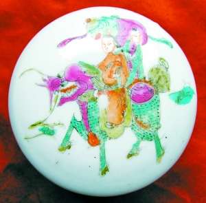藏友的這件清代麒麟送子粉盒高5.3厘米, 直徑7.7厘米,底徑5厘米,保存非常完整,粉盒上的圖案畫工精細,色彩也比較鮮艷。