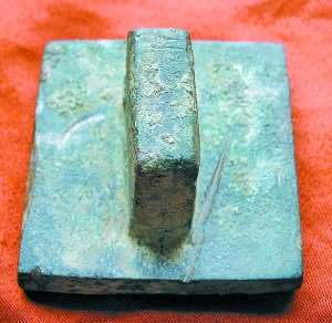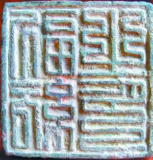 陳女士帶來的這方青銅印章很是引人注目,經(jīng)鑒定,這是一方金代的官印,印文為九疊篆書陽文“副統(tǒng)之印”,印面為正方形,橛鈕,通高4.08厘米,印臺厚1.23厘米,邊長6.4厘米,重481.9克。鈕旁陰刻有“副統(tǒng)之印”文字。鈕頂部刻一 “上”字。