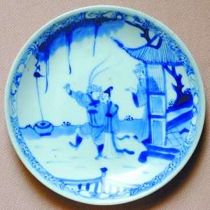這件青花戲曲人物紋盤口徑11.63厘米,底徑6.5厘米,內壁繪有青花戲曲人物三個,畫工飄逸自然,青花色澤清麗淡雅。周圍繪有樓臺、山水、草木等。外底素胎無釉,無款識。一般了解青花瓷的藏友都知道,明代晚期青花瓷的特點是色彩相對淡雅,人物也畫得自然飄逸。而且明末清初時期,文學藝術繁榮,不僅為瓷器紋樣提供了豐富的創(chuàng)作題材,而且還深刻影響著瓷器裝飾畫面的藝術表現(xiàn)手法,這與明代萬歷以來帶有版畫的戲曲劇本的大量流行有關。民窯瓷器上的許多人物畫中除了常見的嬰戲圖、八仙祝壽圖外,表現(xiàn)戲曲故事也特別盛行,《三國演義》、《西廂記》、《水滸傳》等作品中的內容比比皆是。這也正好符合這件青花瓷盤的特點。