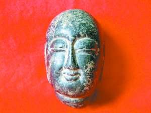 點評內容:這件北齊石雕佛頭像高6.5厘米,長寬均為4厘米。石質為黑色大理石,包漿厚重,黑潤亮澤,橢圓頭型,兩耳垂肩,廣額豐頰,彎眉鼓目,懸膽長鼻,小口方唇,面帶微笑,形象傳神。其雕琢細膩,技法嫻熟,表現(xiàn)出北齊石雕佛像的典型風格。辟支佛,是辟支迦佛陀(Pratyekabuddha)的簡稱,為緣覺乘的最高果位。