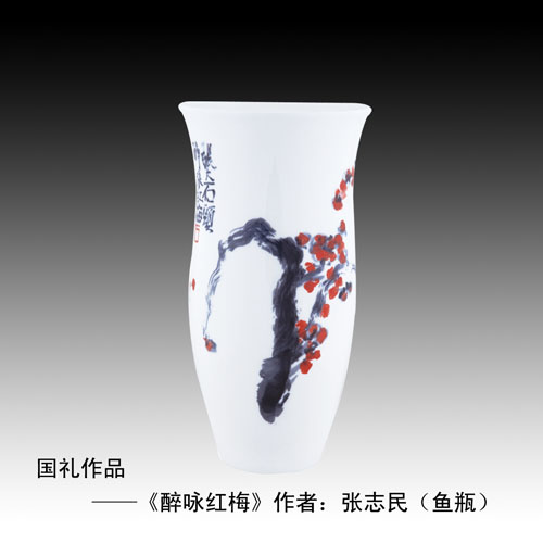 《醉詠紅梅》是山東省美術(shù)家協(xié)會(huì)主席張志民先生的作品,海瓷藝術(shù)瓶上的梅花花枝剛勁,花朵惟妙惟肖,耐人品味。它通過(guò)梅花特有的象征意義,表達(dá)中國(guó)人民和美國(guó)人民可以像梅花那樣以頑強(qiáng)的毅力面對(duì)所有的困難。