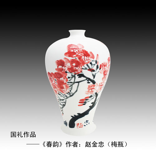 《春韻》是中國(guó)美術(shù)家協(xié)會(huì)會(huì)員趙金忠先生的作品。《春韻》在色彩和墨韻的層次變化中,透出韌性和力量,整個(gè)畫(huà)面達(dá)到完美的藝術(shù)境界。瓶體上栩栩如生的映山梅正在綻放,細(xì)細(xì)品讀,會(huì)有一股春風(fēng)吹過(guò)的感覺(jué)。它可以很好的表現(xiàn)出中美政府和人民對(duì)中美關(guān)系的一種期待。
