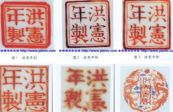 年號款始于明永樂,終于民國?钍綆捉(jīng)變化,延續(xù)了500余年。民國時期的年號款僅見有“洪憲年制”、“洪憲御制”兩種。此年號正式使用于1916年元月1日至3月23日,總計83天,若從1915年12月12日袁世凱改國號為“中華帝國”,以次年為“洪憲”元年來講,此年號存在了110天。但此款識給后人留下了很大的謎團。有學者認為均為仿款,有學者認為“洪憲年制”有少數(shù)真款。“洪憲御制”均為仿款。但至今仍無一件極具說服力的洪憲瓷器。而從大量此款識的器物來看,民國時期不論高中低檔瓷器,均以書此款為時尚,故真假難辨亦在情理之中。