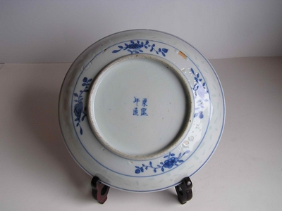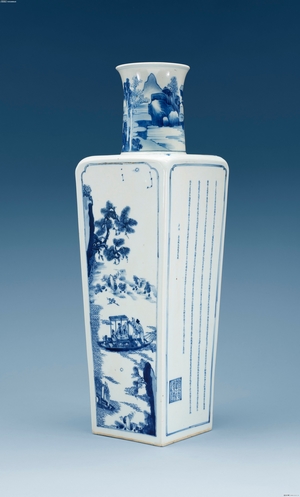 康熙(1662—1722)朝時間跨度長,器物類型豐富,工藝水平高超。此期使用浙料和珠明料,青花發(fā)色前期較灰暗,中期以后青幽翠藍(lán)、明快亮麗。畫法早期以單線平涂為主,氣勢粗獷;中期以后則勾勒、渲染、皴法等并用,繪畫精細(xì),并以青花色階(即所謂“青花五彩”)而備受推崇。紋飾題材多樣,有山水人物、龍鳳花鳥、魚蟲走獸、詩文、博古等,其中最具時代特點(diǎn)的是冰梅、耕織圖、刀馬人、雙犄牡丹等。圖案留白邊較其他朝明顯。胎致密細(xì)白,呈糯米糕狀。釉硬,與胎結(jié)合緊密,見桔皮或棕眼,早期白中閃青,中期以后亮白。器型除日用器外,觀賞瓷大量增多,典型器有蓋罐、鳳尾尊、花觚、象腿瓶、筆筒等。器物的底足也有極強(qiáng)的時代特征:琢器多二層臺底;筆筒多玉璧底;圈足早期的多是兩邊斜削的較尖的“鯽魚背”底,中期以后基本上是圓潤的“泥鰍背”底;大盤類多雙圈底,這種底從明末和順治時出現(xiàn),流行至康熙中期?钭R種類多樣,早期多用干支款,年款多用楷書,中期以后各種堂名款、圖記款、花押款流行,并流行至雍正。仿款、偽托款也較多見,尤其以仿嘉靖款居多。