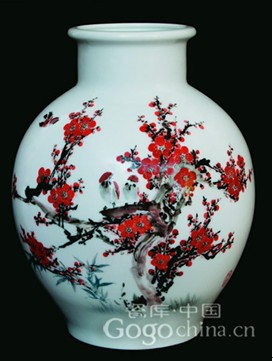 瓷庫中國精選的這款大師手繪花瓶以喜鵲、梅花為主要內(nèi)容,以諧音或表意突出“喜”字,加上梅花鮮艷的紅色,使花瓶的喜慶感更為濃厚。喜鵲落在梅花樹梢上,可稱之為“喜上眉梢”,而兩只喜鵲則代表著“雙喜臨門”。喜鵲因其“喜”,在素愛喜慶的我國是常見的紋飾:繪梧桐、喜鵲,稱“同喜”;繪一豹、一喜鵲,稱“報(bào)喜”;繪二喜鵲、一銅錢,稱“喜在眼前”。