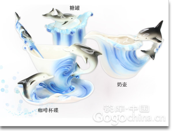 圖:16頭藍(lán)色海豚精品琺瑯瓷咖啡具套裝