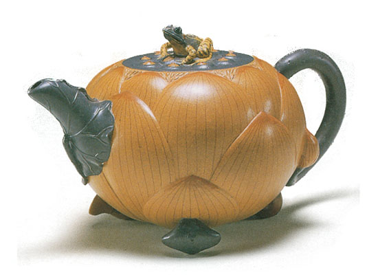 “荷花茶具”是蔣蓉大師的處女作。當(dāng)是還正是紫砂壺花貨創(chuàng)作新的萌芽時期,又逢盛夏六月,盛天的荷花,惹人喜膦,粉紅色的花瓣里裹著碧綠蓮蓬。那綽約的豐姿,高潔的品格,給人以出污泥而不染的形象,深深地吸引著人們。蔣蓉大師決定創(chuàng)作荷花茶具,這是所謂藝術(shù)上的創(chuàng)作構(gòu)思,至于實地觀察以至成型燒制,還要花很大功夫,才能成為一件人們博覽的珍品。采摘實物,凝視觀察,靜思默想是蔣蓉大師多年以來創(chuàng)作紫砂壺花貨茶具不可缺少的過程,因為它的造型要給以人們從美的享受和實用價值來琢磨。要制造荷花茶具,必須摘來荷花,蓮蓬,荷梗,荷葉,凝視觀察客觀存在的形狀,筋絡(luò),色澤,然后運用配色,拼泥以至最后定型。蔣蓉大師以盛開的荷花作壺身,圓鼓鼓的蓮蓬作蓋,彎曲的花梗作壺把,這時候必須用大力氣精細(xì)地把模型的一筋一瓣模仿得惟妙惟肖,這說明了藝術(shù)造型的一絲不茍和嚴(yán)謹(jǐn)性。美化茶具的全身更為重要。再觀察和靜想是保證一件工藝品的造型成功。