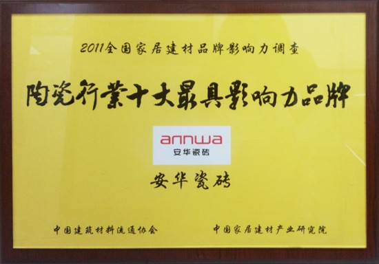2011年8月7日,由中國建筑材料流通協(xié)會、中國家具產(chǎn)業(yè)研究院共同舉辦的“2011全國家居建材品牌影響力TOP榜單”頒獎典禮,于中國人民大會堂隆重舉行。安華陶瓷以其精湛的工藝技術(shù)、自然靈動的設(shè)計風(fēng)格、豐富的產(chǎn)品線贏取了超高的票選支持率,從1200多家參選企業(yè)中脫穎而出,一舉奪得“陶瓷行業(yè)十大最具影響力品牌”盛譽(yù)。