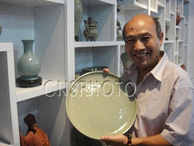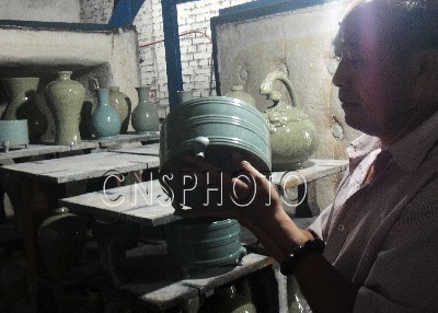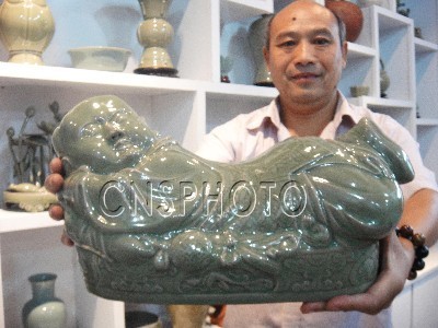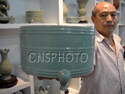 8月19日,著名陶瓷專家馬聚魁展示他新燒制的汝官瓷珍品富貴盤(牡丹圖騰)、汝瓷百子盤(石榴圖騰)、弦紋樽、孩兒枕等。河南寶豐縣汝瓷研究所所長馬聚魁癡迷汝瓷研究燒制,從1976年至今,他共完成攻關(guān)課題20余項。其中,《寶豐紫砂陶》填補(bǔ)了河南紫砂生產(chǎn)的空白,《汝官瓷天青釉、月白釉的仿制研究》更是達(dá)到了國內(nèi)同類研究的領(lǐng)先水平。