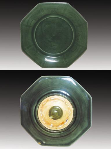 上述兩件元代龍泉青釉盤,器型碩大,口徑都在34厘米以上,它們別具一格的造型,從一個側(cè)面反映了元代龍泉窯大盤獨特的時代風(fēng)貌,在釉色和裝飾上也讓人們看到了元代在宋代的基礎(chǔ)上所具有的時代特征。在一些古陶瓷專著中,在評價龍泉窯青瓷時,認為南宋的梅子青釉在元代已無法燒制,似乎因為政權(quán)的更迭使南宋龍泉窯梅子青失傳了,這種觀點看來是不客觀的,在這三件元代龍泉窯青釉盤中,那件八角盤便是一件典型的梅子青釉,它與南宋梅子青相比毫不遜色,也許更為成熟,它說明元代龍泉窯在南宋的基礎(chǔ)上不僅擴大了生產(chǎn)規(guī)模,在釉色上還繼承和發(fā)展了南宋龍泉窯以釉色著稱于世的優(yōu)良傳統(tǒng)。